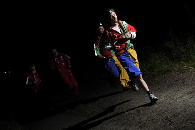 Puzzle 3 at Checkpoint 3. Locate NSPCC collecting boxes hidden in a roped off area. Get it wrong and it was a 10 minute run up and down a hill. Gav counted 6, David counted 8, Steve counted 5, I counted 10 three times, 11 once. How many? The guys asked. “Ten” I said, “But … I probably missed one, and 10 seems too obvious a number, so let’s say eleven.”. The answer? Ten!!! Doh! So up the hill we had to run! One the run back down, I started to laugh. There I was with only my underpants on under my clown suit (they looked like clown suits!), my reading glasses in my pocket running down the Welsh hills – bizarre! Quickly back onto the bikes and then to the bike drop-off point and onto the running stage which was up a big hill and across a couple of small peaks back to the finish. At this