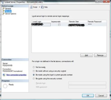 I’ve used linked server in SQL Server on many occasions, but one of the mysteries to me is getting the Security right. Most times I’ve gotten away with simply declaring a common SQL User, which is one heck of a cop out I know, but hey, it works. We were faced with an issue at work t’other day which my cop out wouldn’t work for. We had to call Analysis Services from within a SQL Stored Procedure, but the caller was a SQL Server User used by our Linux based CastIron Integration tool, and in addition Analysis Services does not support SQL Server Users.