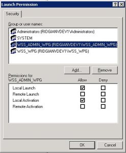 Now you can add the individual account which should be the accounts which run your application pools as I’ve seen elsewhere. I however prefer to add the local groups WSS_ADMIN_WPG and WSS_WPG in instead, as these will automatically deal with any change of account or new accounts which get added later. Then don’t forget to tick the Local Activation for both the new account groups as shown: