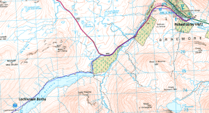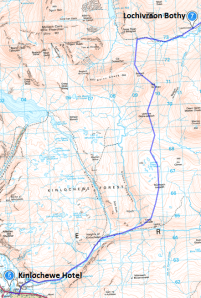 boots and a renewed determination that I could complete the trek I’d set out to do. I decided however on a change to the itinerary. Due to the poor state of my feet after the affair of the boots, I scoured my maps for an alternative to the Shenavall Bothy which was a good 17 miles as the crow flies, not including climbing and descending. I didn’t feel it was a realistic goal for me at the time. This was a good decision! With the help of Andrew at the Kinlochewe Hotel I located another Bothy on the banks of Loch a’ Bhraoin called the Lochivraon which seemed to be run by the Inverbroom Estate, and not the Mountain Bothies Association. It was on the right route to where I wanted to be, so I decided to alter the route to suit. Just as important, there was no major river crossing. It meant heading North East from the Hotel out to a place called Heights of Kinlochewe and then to a crag called Creag Leacaidh. This was all on good path, often suitable for a landrover. Thereafter I had to strike out North first to Mointeach Leacaidh, a very flat topped hill and then North to Groban at 749m which was to be my only real hill for the day. After that North Wets down to Bealach Gorm then North to the path at the foot of Creag Rainich and a simple walk down to the Bothy for the night. I estimated about a 12 mile trip which at about 2 miles an hour comes out about 6 hours. Add in to that stops and I reckoned I’d be at the Bothy between 3 and 4 pm that afternoon if I set out at 8.30am.