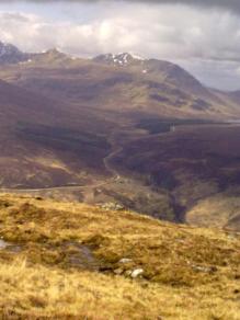 After about 30 mins I found the path and pounded down it until I reached the road again in about another 30 mins. The weather now was gorgeous, it was sunny and warm and the mountains looked idyllic, the peaks rising around me, snow capped and inviting. But it was the end of the trip for me. I was at my final destination. Almost. The Aultguish Hotel was about 7 miles down the road. I was tired and it was just about 5 pm. Getting to the hotel by 7.00pm would be tough, but nothing for it but to start. I set out but immediately stuck out my thumb in the vain hope that somebody might stop. The gods must have been smiling on me because after only about 3 minutes a car pulled in just ahead of me and out popped 3 women who started rearranging their car. I ran up the road as fast as I could asking if the had stopped for me. “You do want a lift?” one of them asked. “Absolutely” I replied. “Just to the end of the next Loch”. “No problem” she said.