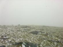 The wind was blowing a a steady pace from the North West, and I kept a weather eye out. The air was so clear as I climbed I could see what the weather would be doing in the next hour or so. I could see bands of clouds interspersed with bands of sunshine and they were all heading my way. So I stepped up the pace and found that at last I had my ‘match fitness’ back. I was bounding up the slope, hopping from tussocky mound to mound. I found a track followed that for a bit then headed straight up again. Glancing behind me I could see a particularly heavy band of rain heading my way… or was it snow …? Anyway the top of Beinn Enaiglair seemed close enough so I put in an extra effort and pounded up the slope until I felt the first specks of rain/snow on my head. Checking again I could see the snow was right behind me. Glancing ahead I saw a cairn on what I thought was the summit of the mountain so I literally ran for it. I got there just as the snow piled in and in seconds it had gone from a sunny day with wonderful views to less than 10 yards visibility with driving sleet and snow. If ever I needed a reminder of the rapidity of change in mountain weather, I’d just been reminded! It wasn’t quite a complete whiteout, but it was no use really trying to go any further at present. Also I had seen that the snow would not last long. I estimated about 20 mins max, it