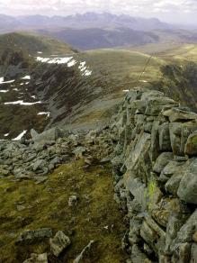 rather worryingly deep into the corrie on the North West of Beinn Dearg. A pretty spectacular drop I might say. I paused to take a picture of that wall, then cut across the peak and headed towards the summit which was now completely clear of clouds. I came across some large fields of snow and enjoyed crunching through the stuff. It was quite old , end of year stuff, but still wonderful to step across, in the sunshine at the top of a beautiful mountain.