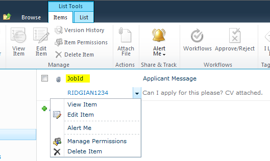One of the things that we’ve often wanted to do in SharePoint 2010 is to not have to have the Edit Control Block or ECB attached to the Title field, if you’re not sure what the ECB is, it’s that drop down menu on the standard List View page. For instance, recently I wanted it attached to a field called JobId.