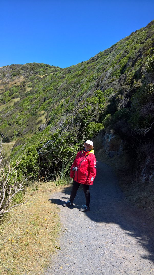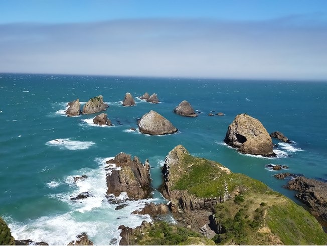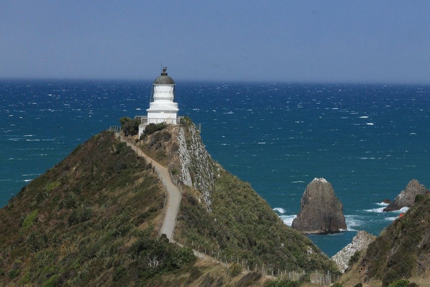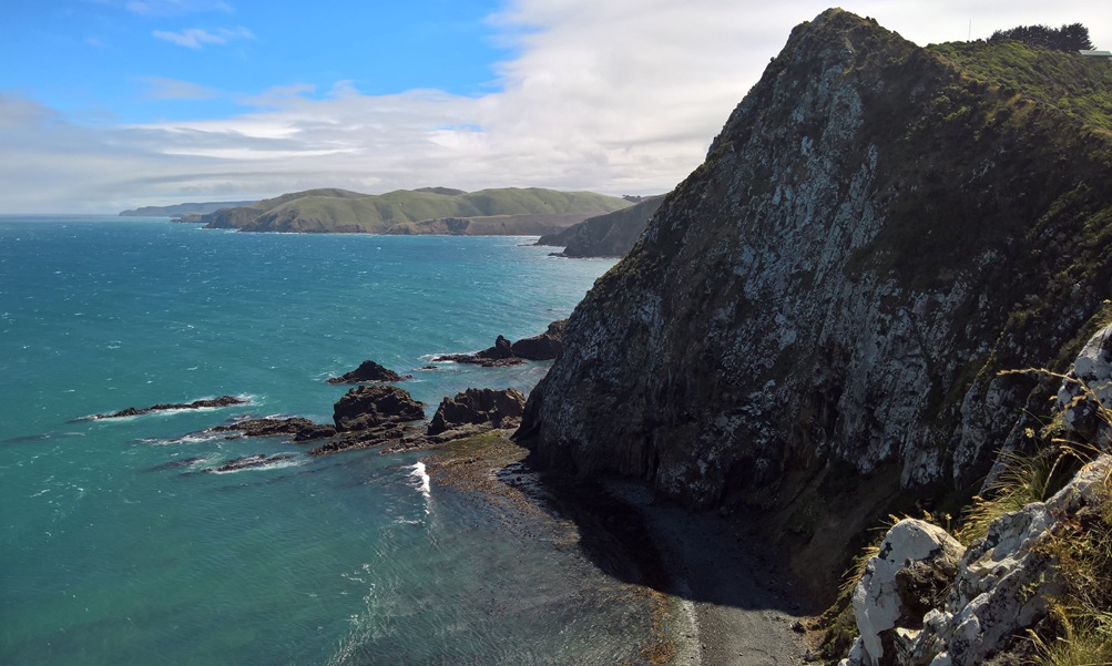 Leaving our sea lion friend on the beach to rest, we drove on up the headland of Nugget Point. We parked up and walked along the marked track. The views got ever more spectacular as we got along the narrow path, and the drop on the left hand side got ever steeper and deeper. Coming out of the trees we were met with a dramatic coastal landscape, that was one of the highlights of our trip. The wind had got up by now and as we approached the lighthouse itself, the wind became ever stronger as the cliffs towering all around us funneled the sea air at us. But what a view, with the sun shining he scene was utterly beautiful, the sea an incredible blue-green and the rocks and cliffs a blaze of colours.