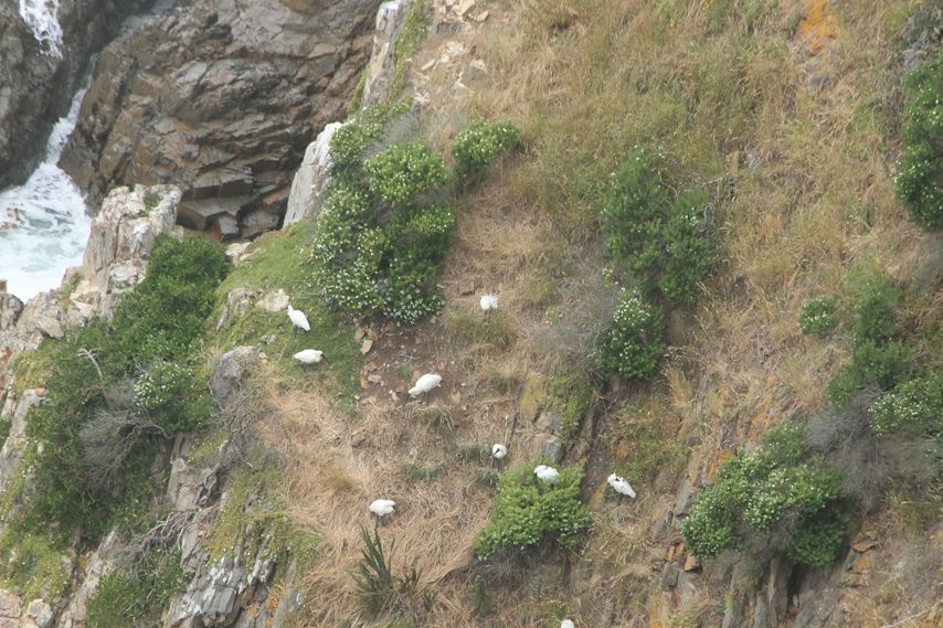 We could see however out to sea, the weather was closing in, so we called it a day and headed back to the car park and picked up the van as it started to rain and the clouds rolled in around us. Before we got back in the campervan though we saw something really odd. Spoonbills on the near-vertical steep cliffs! We had no idea these birds could nest or feed in such a place. Weird! We made a brief visit to Roaring Bay, parked up, had some scones and tea and visited the hide in an attempt to spot the yellow-eyed penguin, but they apparently had no chicks this year and so were unlikely to come back, and we saw nothing.