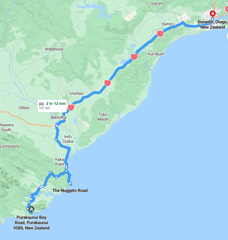 We did another stop off at the pretty Purakaunui Waterfalls, after that for the rest of the day South Island gave us the real South Island weather treatment and it rained hard and blew hard as we drove down through the Catlins as we headed to our overnight stop at the Department of Conservation campsite at Purakaunui Bay. The bay was very isolated with no signal, the sea was up and rough and the wind rattled around us. We were glad we were not in a tent for the night! Here’s the route for the day’s driving below