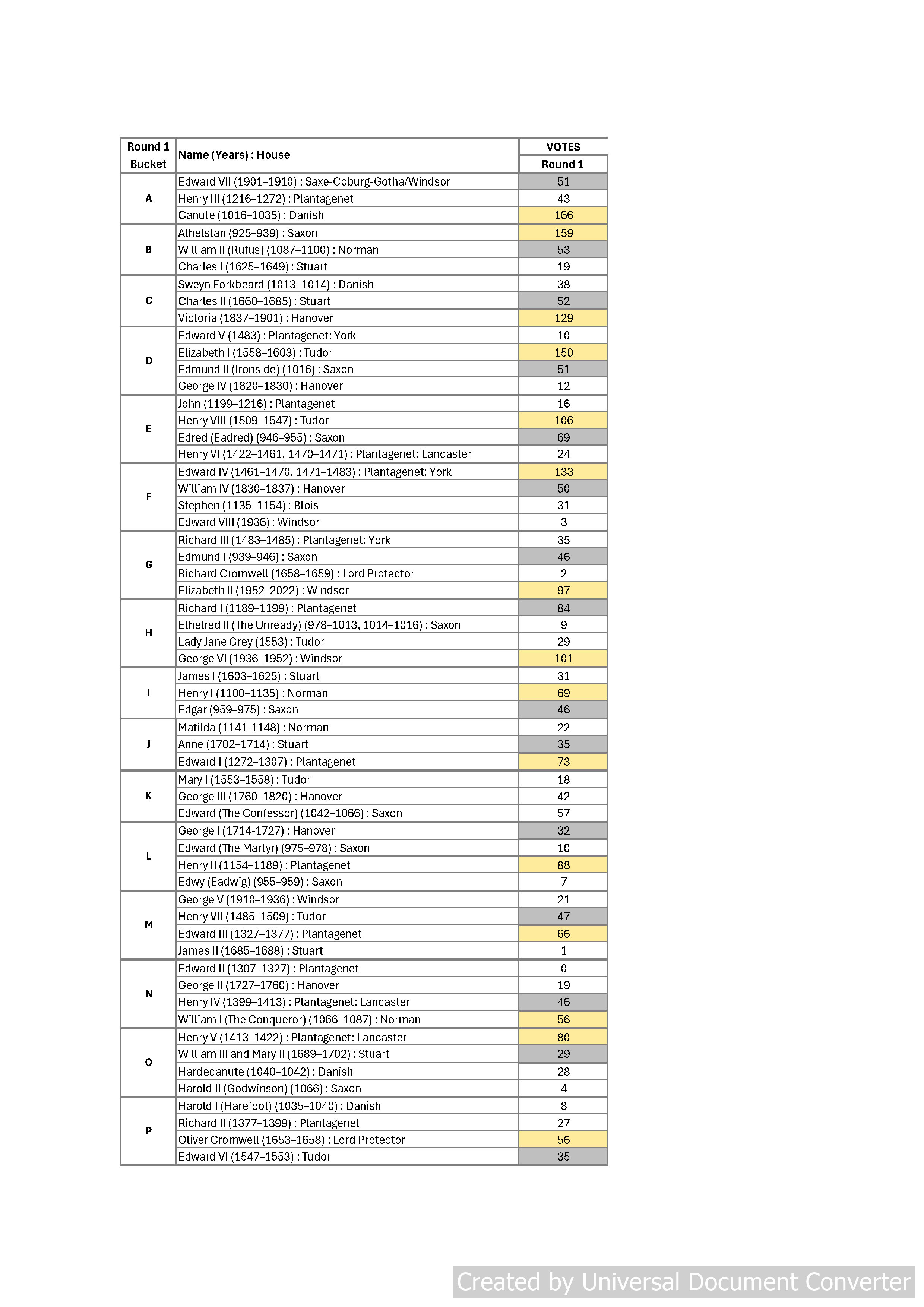 I’ll list the rulers of England in the order they were voted for, along with the short summary about each one which was made available to the HoE members, along with the number of votes they scored in Round 1. At the end of the post you will find the Summary of Scores and then the draw from Round 2 onwards into the Final.